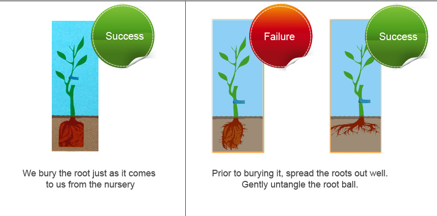 Gently untangle the root ball before planting, spreading the roots out in the planting hole. Cut and heal any broken roots, especially the larger ones, as they are an open door to all sorts of soil fungi diseases.